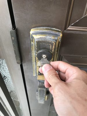 では作業に入ります。まずは玄関ドアに付いている錠前を分解してキーシリンダーを取り出します。